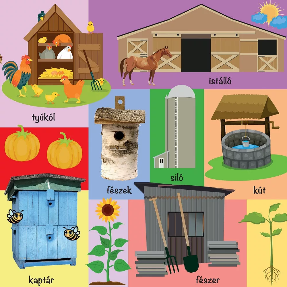 Az „101 színes kép a tanyáról” egy strapabíró, keménylapos babalapozó, amely elrepíti a legkisebbeket a vidék mozgalmas világába. A vastag kartonlapokon élénk, fotórealisztikus illusztrációk mutatják be a tanya állatait, növényeit, járműveit és épületeit, miközben a nagyméretű, jól olvasható feliratok játékosan bővítik a szókincset. A kompakt, könnyen lapozható könyv otthon és utazás közben is ideális társ, egy pillanat alatt kalandos felfedezőjátékká válik.