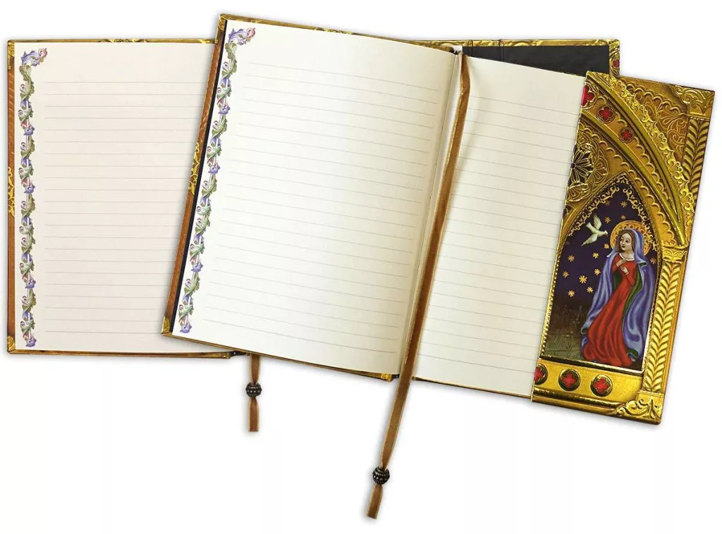 Az Arte Sacro kollekcióba tartozó Boncahier Medievo napló egy 14×18 cm-es, keményfedeles ékszerdoboz, amely középkori oltárképet idéző, arany prégeléssel díszített borítót kapott. A mágneses fedőlap finoman záródik, így a belső, vonalas lapokon biztonságban maradnak gondolataid. A margókat finom ornamentika szegélyezi, a bársonyszalag könyvjelző végén fémgömb csillan. Legyen szó naplóírásról, lelki jegyzetekről vagy ajándékról, a kötet inspiráló társ a mindennapokban.