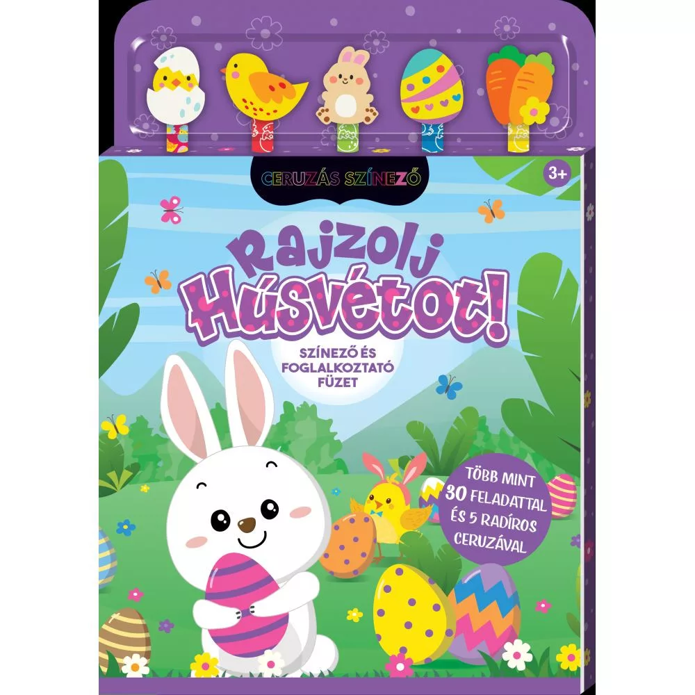 Ceruzás Kifestő – Rajzolj Húsvétot! egy kedves húsvéti színező- és foglalkoztató füzet, amelyben több mint 30 feladat – tojásdíszítés, labirintus, különbségkereső és sok más – segíti a 3 évnél idősebb gyerekeket abban, hogy játék közben fejlődjön kézügyességük és figyelmük. A vastag ofszet papír jól bírja a radírozást, a csomagban található öt, tavaszi motívummal díszített radíros színes ceruza pedig azonnali alkotásra csábít. Engedd, hogy a nyuszik, csibék és színes tojások életre keljenek a lapokon!