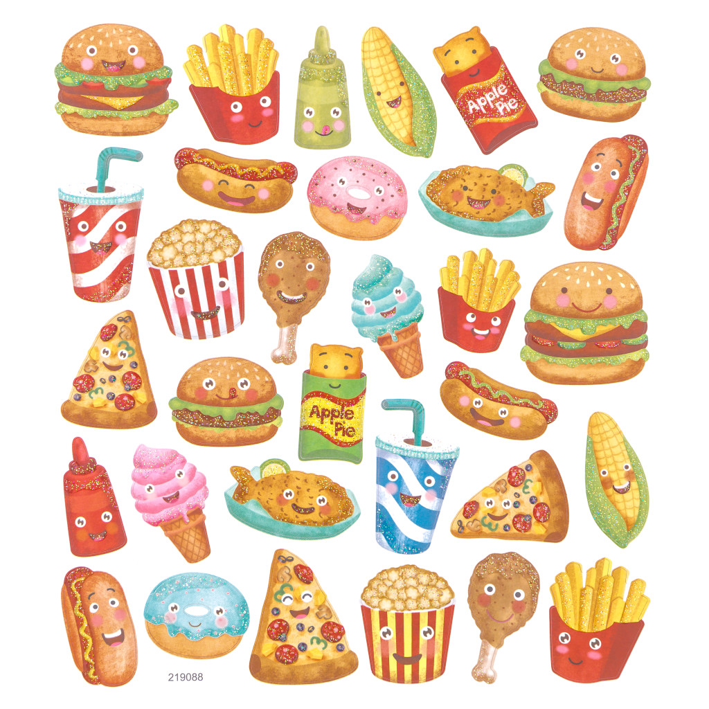 Aranyos, színes papírmatricák vicces snack témákkal. Minden matricát fényes csillogás díszít.