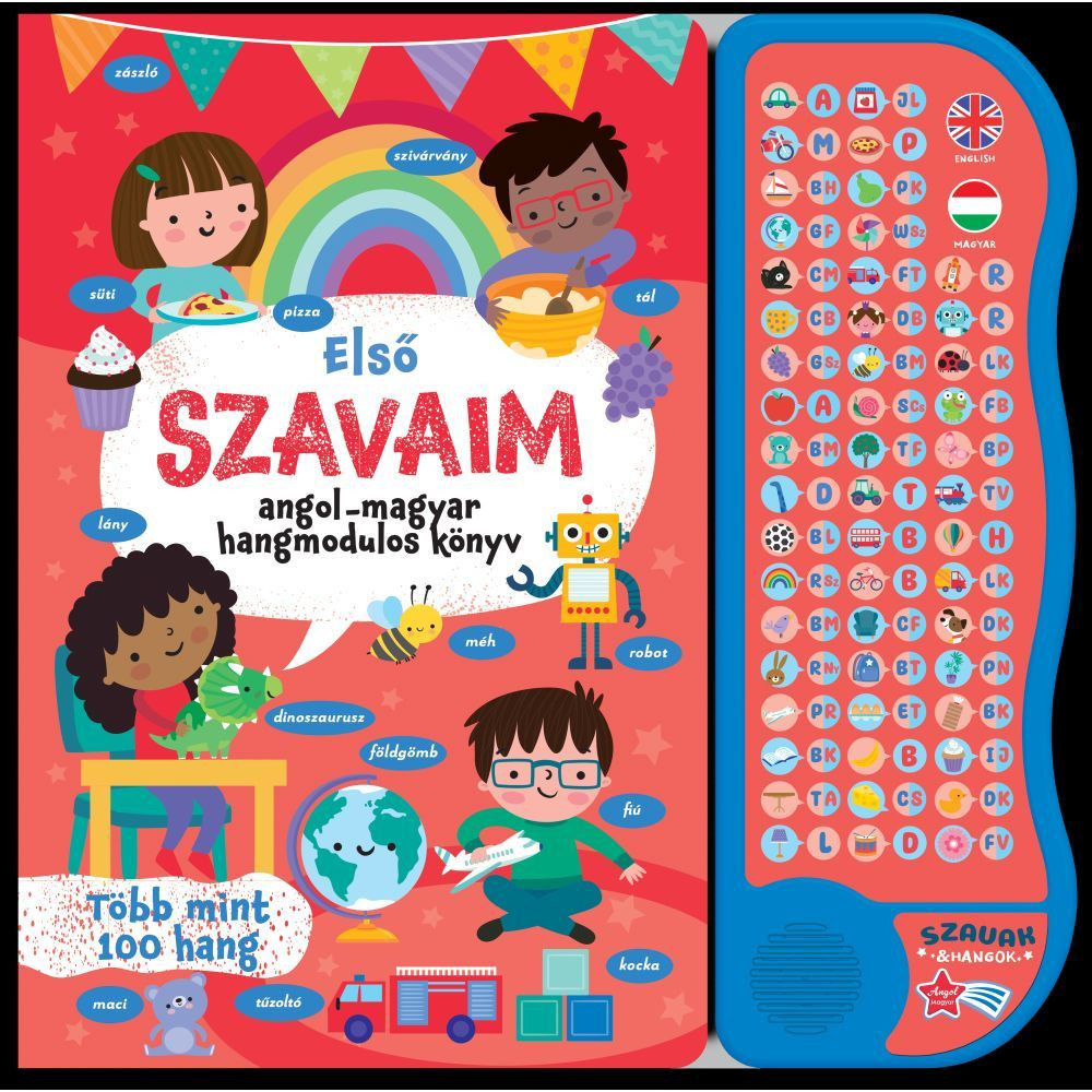 Az Első szavaim angol–magyar hangmodulos könyv strapabíró kartonlapokra épülő, interaktív kiadvány, amely több mint 100 mindennapi szót mutat be magyarul és angolul. A beépített, elemmel működő hangmodul gombjai a képekhez tartozó kiejtést játsszák le, így a gyerekek egyszerre látnak, hallanak és ismételnek. A vidám illusztrációk játékra hívnak, a lekerekített sarkok biztonságot adnak, a fóliabevonat pedig könnyen tisztítható. A könyv játékos formában fejleszti a szókincset, a hallás utáni megértést és a finommotorikát – egy gombnyomással megnyílik a kétnyelvű világ!