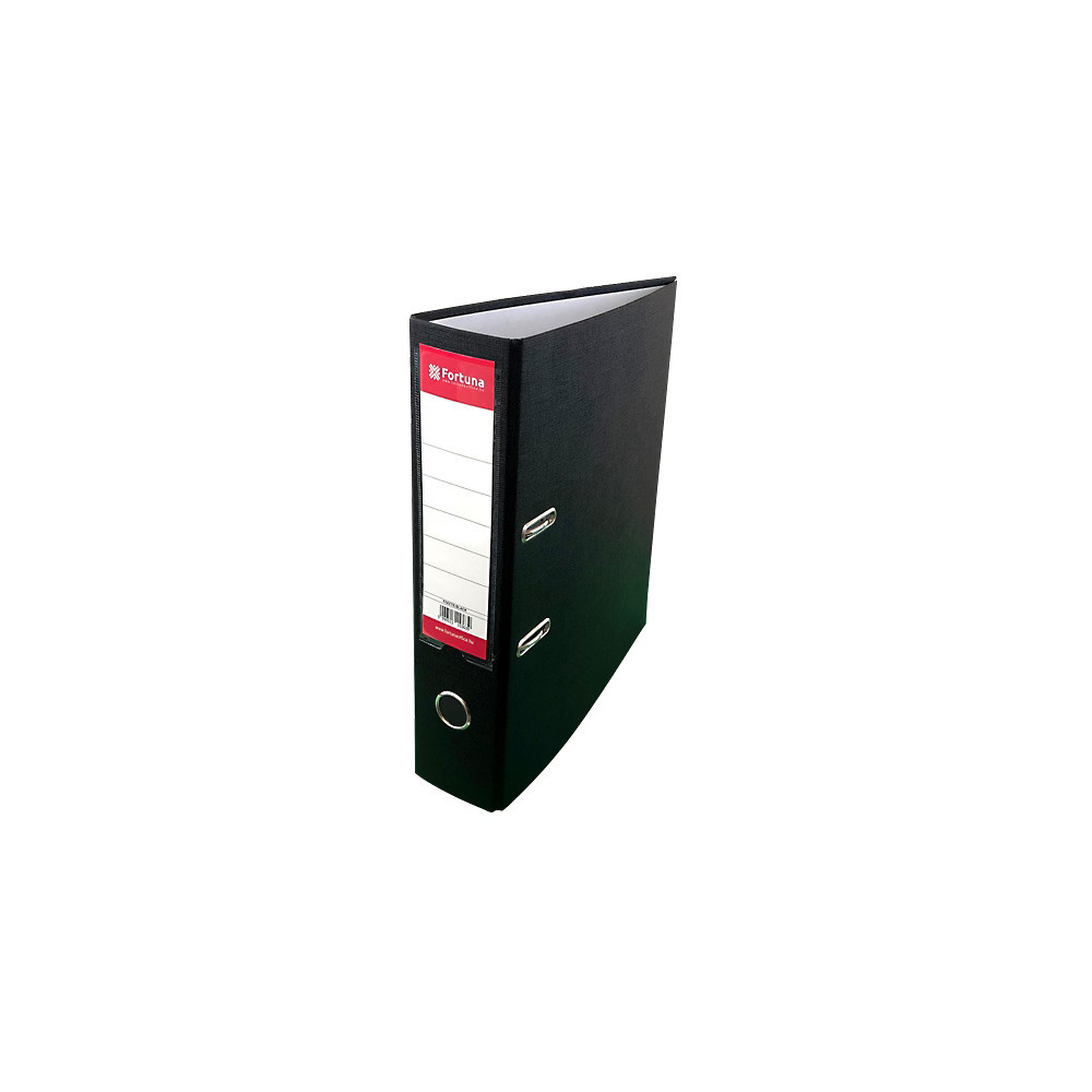 A Fortuna A/4-es, 75 mm gerincszélességű fekete iratrendező megbízható társ a mindennapi dokumentumkezelésben. Külső felületét tartós műanyag borítás védi a fröccsenő folyadéktól és a kopástól, belsejét papírréteg fedi a letisztult megjelenés érdekében. A hegesztett, 195 mm hosszú címketartó cserélhető gerinccímkével segíti a gyors azonosítást. A karos, kétkapcsos fém mechanika és a fém leszorító stabilan tartja a lefűzött lapokat, míg a kihúzógyűrű megkönnyíti a levételt a polcról.