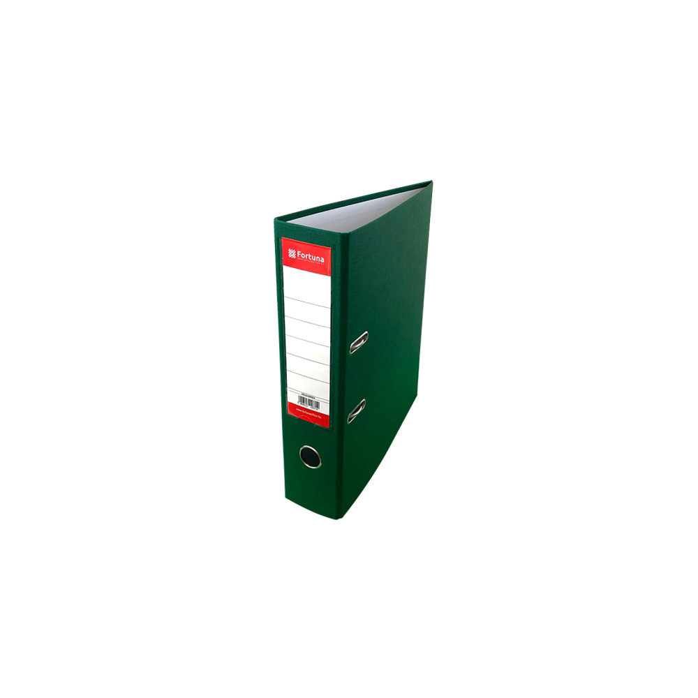 Az A/4-es méretű, 7,5 cm gerincszélességű zöld Fortuna iratrendező strapabíró megoldást nyújt mindennapi irattárolási feladatokhoz. Külső felülete műanyaggal bevont karton, így ellenáll a nedvességnek és a kopásnak, belül papírborítás gondoskodik a rendezett, letisztult megjelenésről. A gerincre hegesztett, 195 mm hosszú címketartó cserélhető, egyszínnyomott címkével segíti a gyors azonosítást. A karos, kétkapcsos fémmechanika és a fém leszorító stabilan rögzíti a lefűzött dokumentumokat, míg a kihúzógyűrű egyszerű kivetelt tesz lehetővé polcról.