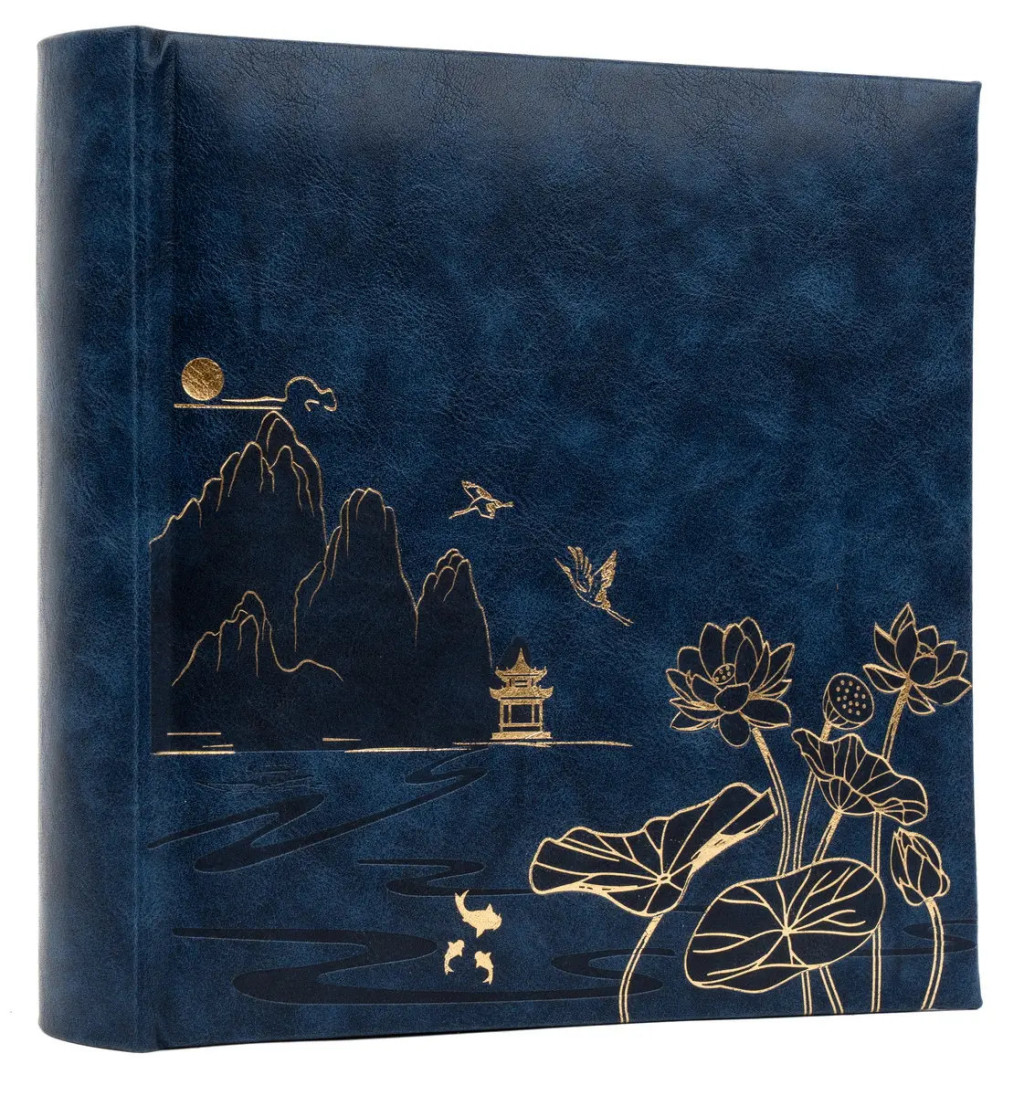 A Gedeon Lotus kék fotóalbum elegáns, könyvkötésű kiadás, amely 22 × 22 cm-es méretével kényelmesen elfér egy polcon, mégis méltó helyet ad 200 darab 10 × 15 cm-es fényképnek. A sötétkék borítón aranyszínű lótusz- és tájkép motívum díszlik, így az album nemcsak emlékei őrzője, hanem stílusos dekorációs kiegészítője is otthonának.