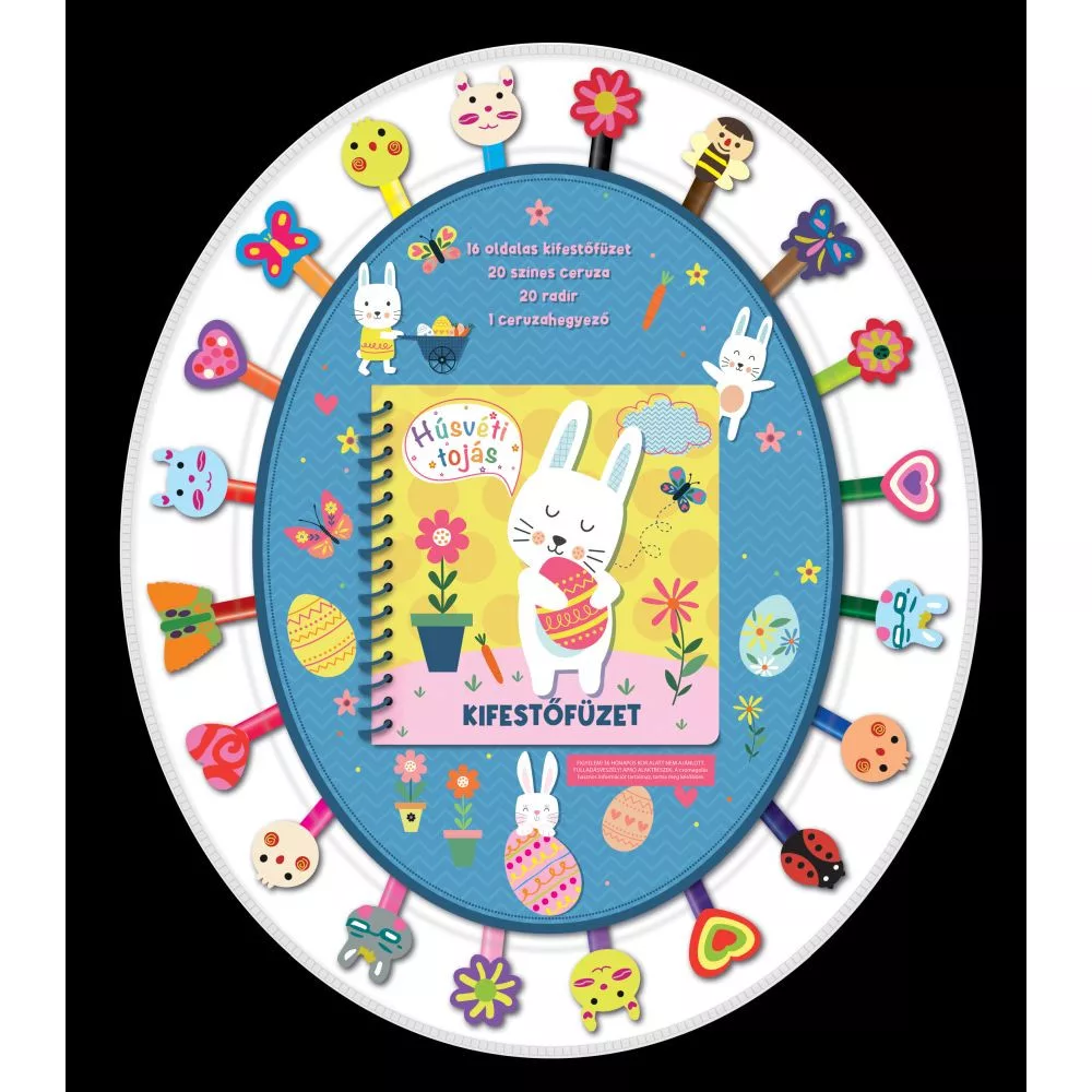 A Húsvéti Tojás kifestőfüzet egy vidám, spirálkötésű alkotócsomag, amely 16 vastag, jól fedő papírlapon kelti életre a nyuszikat, csibéket és díszes tojásokat. A mellékelt 20 színes ceruza, 20 mókás radír és egy praktikus ceruzahegyező gondoskodik róla, hogy azonnal belevághass a színezésbe. A füzet nemcsak az ünnepi hangulatot varázsolja a gyerekszobába, hanem fejleszti a finommotorikát, a színérzéket és a kreatív önkifejezést is.