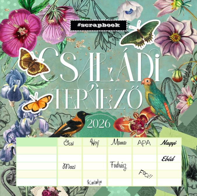 A Lizzy Calendar Anyu Tervezője 30×30 cm-es falinaptár minden mozgalmas család nélkülözhetetlen segítőtársa. A jó minőségű, vastag papírra nyomtatott scrapbook stílusú illusztrációk vidám hangulatot teremtenek, miközben a rácsszerkezetű havi beosztásban külön oszlop jut minden családtagnak. Így az edzések, születésnapok, színházjegyek és bevásárlólisták egyetlen pillantással átláthatók. A spirálos felső kötésnek köszönhetően könnyedén felfüggeszthető és lapozható.