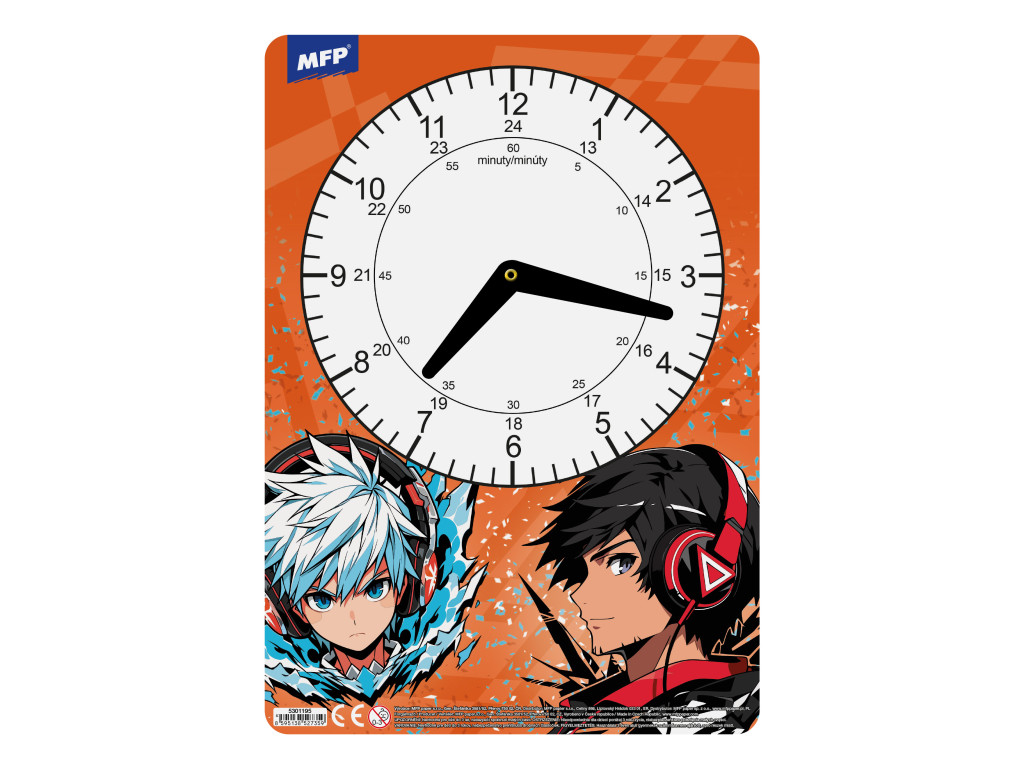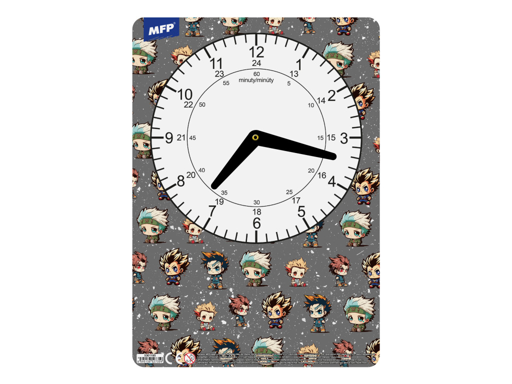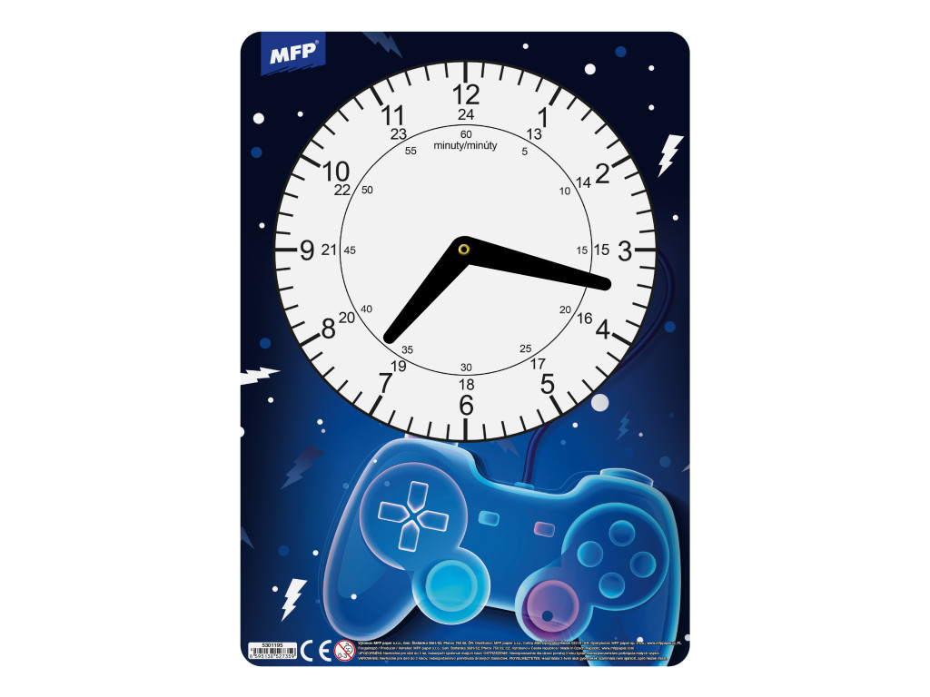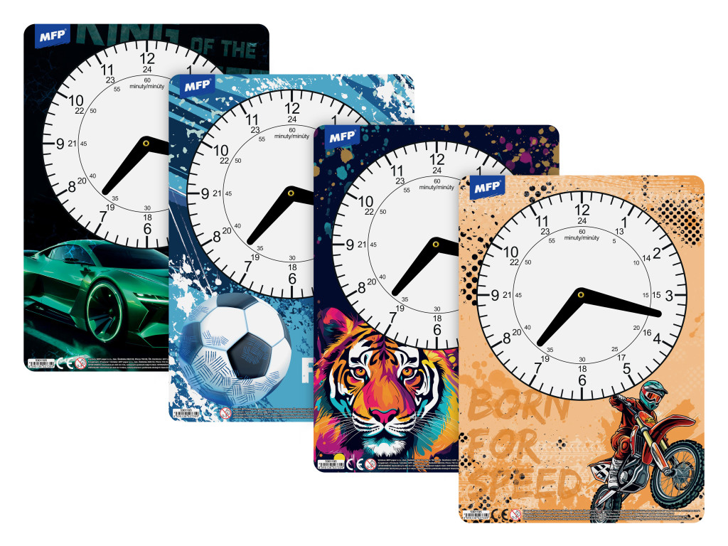 Az MFP Fiús Minták gyakorlóóra szemléletes, játékos eszköz az idő fogalmának elsajátításához. A vastag karton alap stabil tartást ad, a könnyen forgatható műanyag mutatók pedig élménnyé teszik az órák és percek beállítását. A sportautó, focilabda, tigris vagy motor témájú háttér azonnal megragadja a kisiskolások figyelmét, így a tanulás valódi kalanddá válik.