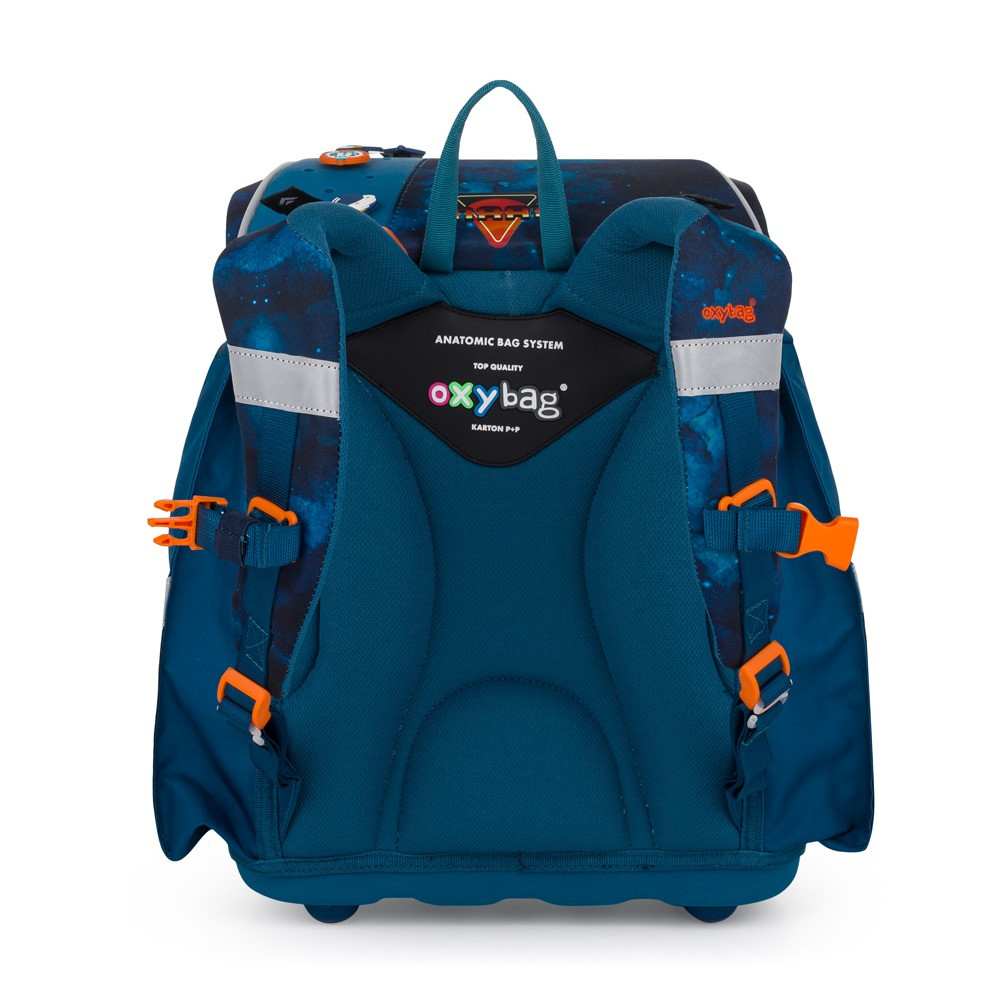Az OXY PREMIUM LIGHT Merevfalú Iskolatáska 26 Liter Space egy könnyű (mindössze 0,97 kg), mégis strapabíró, merev oldalfalú hátizsák, amelyet kifejezetten alsó tagozatos iskolások mindennapi igénybevételére terveztek. Merev váza védi a tankönyveket a gyűrődéstől, 26 literes belső tere pedig elegendő helyet biztosít a füzeteknek, tornazsáknak és uzsonnának. Kék alapszínét látványos űr-grafika, fényvisszaverő csíkok és narancs cipzárak teszik izgalmassá, így nemcsak praktikus, hanem inspiráló is: minden reggel űrutazássá varázsolja az iskolába indulást.