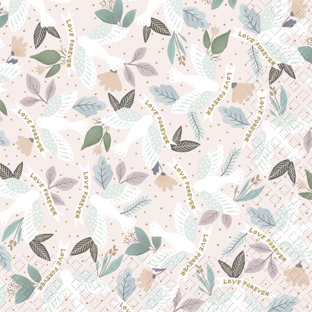 A Stewo romantikus „Duva” szalvétája finom pasztell galamb- és levélmotívummal, aranyszínű pöttyökkel díszített, így stílusos kiegészítője lehet ünnepi és hétköznapi terítéknek egyaránt. A 100 % cellulóz alapanyagú, háromrétegű papír puha tapintást és nagy nedvszívó képességet biztosít. Egy csomag 20 lapot tartalmaz, melyek kihajtva 33 × 33 cm-esek ‒ így tortaszelethez, kávéhoz vagy teljes tányérterítéshez is ideálisak.