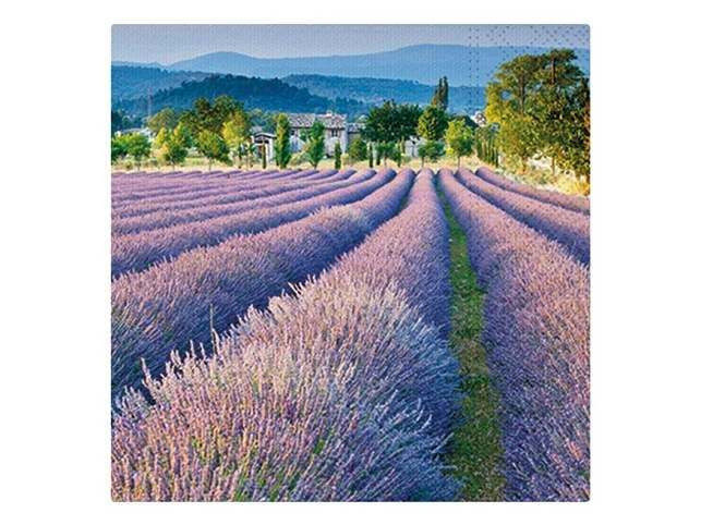 Háromrétegű papírszalvéta. A gyönyörű, minőségi szalvéták levendulamező mintával, kellemes hangulatot varázsolnak. Ideális kerti terítékhez, ünnepségekhez vagy belső dekorációhoz.