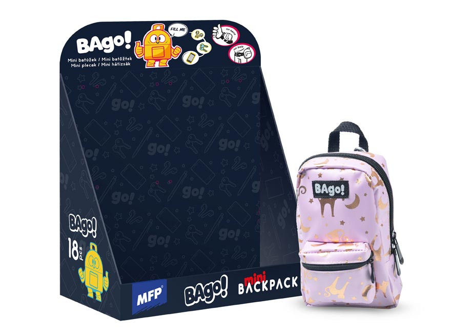 A Bago! Mini Hátizsák Lila az ikonikus hátizsákformát ötvözi egy kulcstartó méretével, hogy a mindennapok apró, de fontos tárgyai – kulcs, pénzérme, fülhallgató vagy pendrive – mindig kéznél legyenek. A könnyű, mégis erős, vízlepergető poliészter megóvja a tartalmat egy váratlan esőben is, a lila alapon csillogó arany macska-, hold- és csillagmotívum pedig játékos, trendi megjelenést kölcsönöz. Kulcskarikára, táskára vagy övre rögzítve egyszerre válik dekoratív kiegészítővé és praktikus minitárolóvá – inspiráló apróság, amely mosolyt csal kicsik és nagyok arcára.