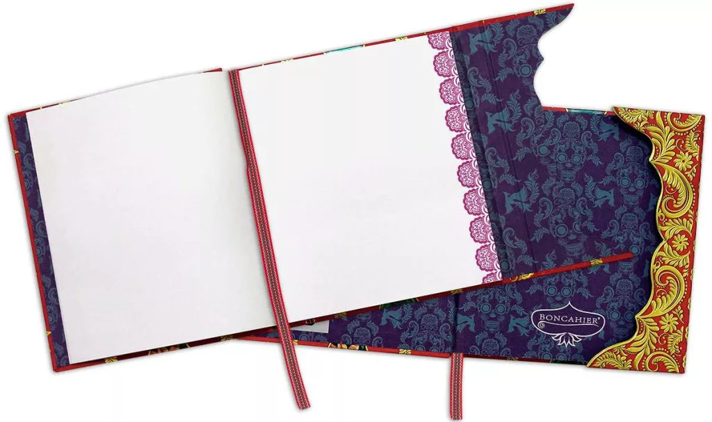 A Boncahier Cielito Lindo napló egy 18 × 17 cm-es, dekoratív keményfedeles jegyzetkönyv, amelynek borítóját Frida Kahlo ikonikus arcképe és élénk virágmotívumok díszítik. A szemet gyönyörködtető, arany tónusú keret és a szövött könyvjelzőszalag elegánssá teszi, miközben a belső, sima felületű lapok teret adnak gondolatok, vázlatok és ötletek rögzítéséhez. Egyetlen nyitással máris Mexikó színpompás világába csöppenünk, így minden bejegyzés kreatív utazássá válik.