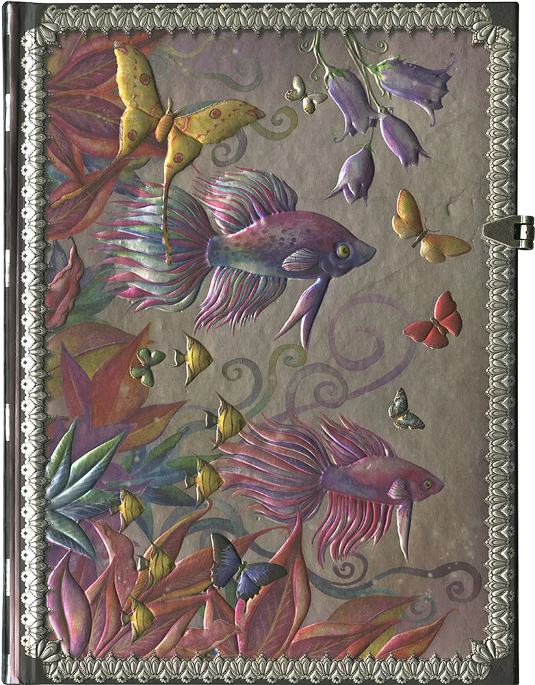 Boncahier Onírica napló A/5 méretben, 144 sima, prémium minőségű oldalával szabad teret ad gondolataidnak. A kézzel dombornyomott, kemény borítón egzotikus harcoshalak és pillangók lebegnek, ezüstszínű fémperem és pattintható kapocs óvja a belsőt. A szálfűzött gerinc tartós, a savmentes papírra egyaránt élmény írni, skiccelni vagy akvarellt fröcskölni. Merülj álomszerű víz alatti világokba, és hagyd, hogy a napló inspiráljon új történetekre!