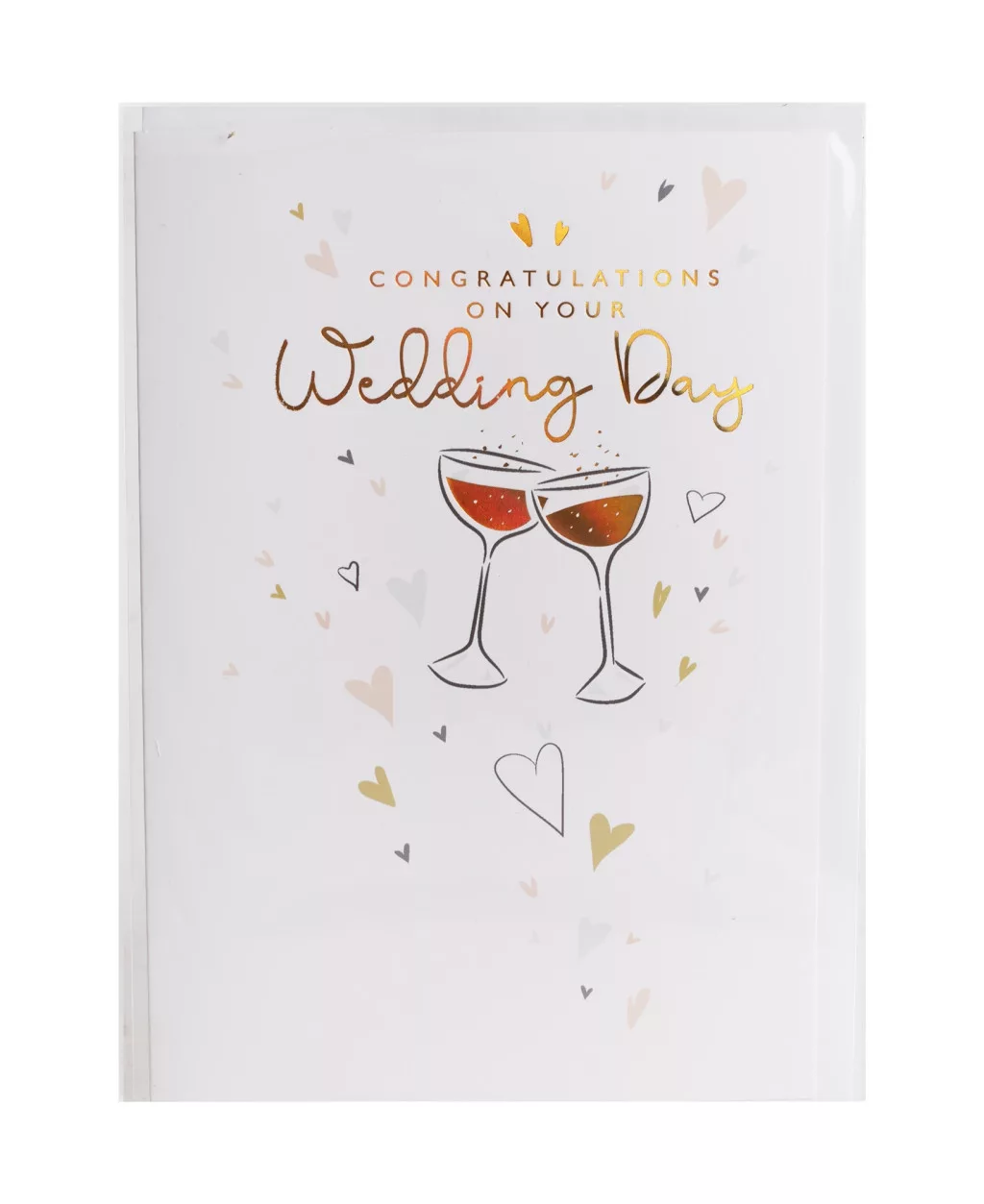 Az Esküvői Képeslap Angol Felirattal 13×19 cm egy letisztult, elegáns üdvözlőkártya, amely tökéletesen kifejezi jókívánságaidat az ifjú pár felé. A fehér kartonpapírra nyomott, pezsgőspoharakat ábrázoló grafika aranyfóliás Congratulations on your Wedding Day felirattal egészül ki, így már önmagában is ünnepi hangulatot teremt. Finom pasztell szívecskék díszítik, hogy még szeretetteljesebb legyen az összhatás.