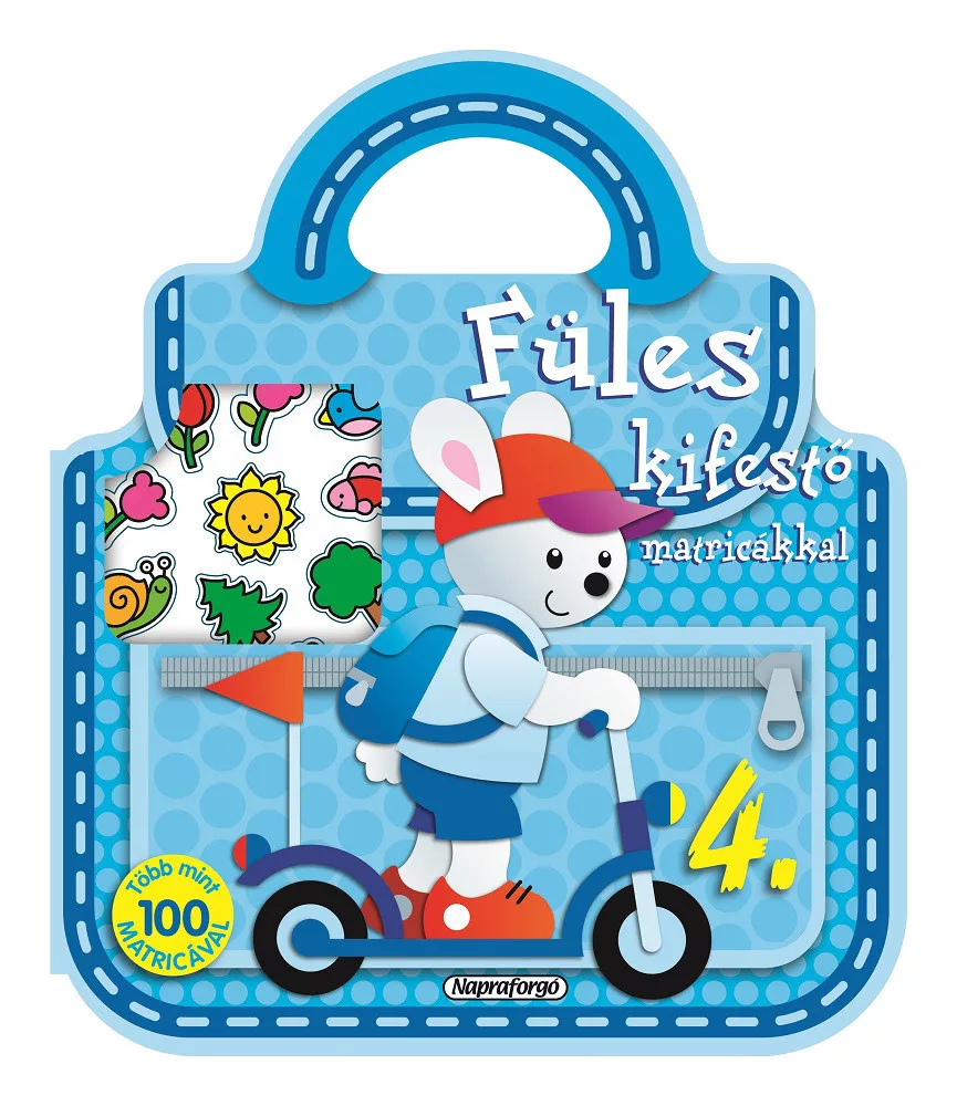 Füles, a mindig vidám kis nyuszi ezúttal rollerezni indul – a táska formájú, fogantyús kifestőkönyvben tízpercnyi utazásra is magaddal viheted. A vastag, fehér ofszetpapírra nyomtatott rajzok könnyen színezhetők zsírkrétával, filccel vagy színes ceruzával, a több mint 100 vidám matrica pedig feldobja a jeleneteket. A Napraforgó kiadványa masszív kartonborítóval készült, így az apró kezek is bátran lapozhatják. Engedd szabadjára a fantáziád, és varázsolj saját háttérvilágot Füles gyors kalandjához!