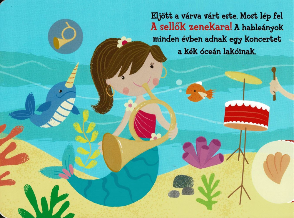 Hangos cimborák – A zenekar egy strapabíró, keménylapos, magyar nyelvű hangmodulos könyv, amely öt gombnyomásra induló hangszerhanggal varázsolja élménnyé a mesélést. A vastag kartonoldalak és a beépített, műanyag hangpanel kisgyermek-barát kivitelben készültek, így a kicsik bátran lapozhatják, hallgathatják a kürt, zongora, szaxofon, trombita és gitár vidám dallamait. A tenger alatti zenekar szereplői játékosan vezetik be az olvasót a hangszerek világába, inspirálva a közös éneklésre és ritmusjátékra.