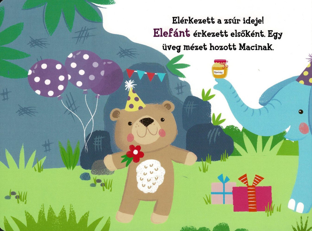 A Hangos cimborák – Boldog születésnapot című interaktív lapozó vidám állatfigurák társaságában ünnepelteti meg a születésnapot. A kemény kartonból készült, lekerekített sarkú oldalak jól bírják a kisgyerekek lelkes lapozgatását, a beépített öt hanggomb pedig igazi partit varázsol: minden jelenethez külön dallam vagy állathang tartozik. A hangmodul egyszerűen kezelhető, a színes illusztrációk közös mesélésre hívnak.