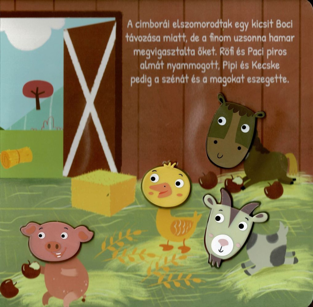 Hangos cimborák – Móka a farmon egy masszív kartonlapokra nyomtatott, beépített hangpanellel kiegészített lapozó, amely vidám illusztrációkkal és valósághű állathangokkal varázsolja élménnyé a mesélést. A lekerekített sarkú oldalak biztonságosak a kicsi kezeknek, a gombok megnyomására pedig megszólal a tehén, a kacsa, a ló és a többi barátságos farmlakó – igazi interaktív felfedezés a legfiatalabb olvasóknak.