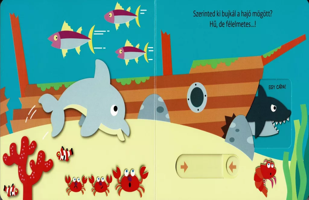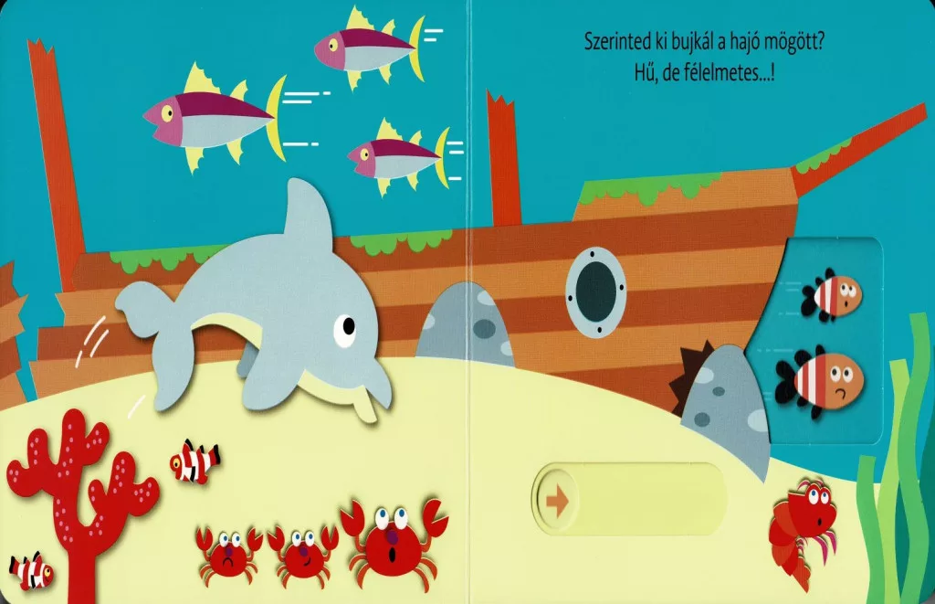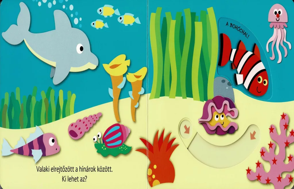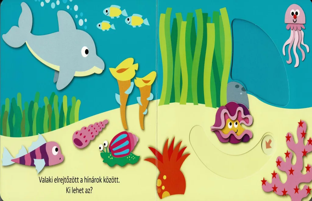 A „Hová bújtam? – Tengeri állatok” vastag kartonból készült, mozgatható elemes lapozó, amely játékosan vezeti be a legkisebbeket a tenger élővilágába. A kihúzható fülek mögül bukkannak elő a delfinek, sirályok és egyéb tengeri barátok, miközben a gyermekek tippelhetnek, ki rejtőzik a képen. A masszív kialakításnak köszönhetően bátran forgathatják a kíváncsi kezek, a színes illusztrációk pedig fejlesztik a megfigyelőképességet és a finommotorikát. Egy pillanat alatt otthoni felfedezőtúrát varázsolhatsz a kanapéra!