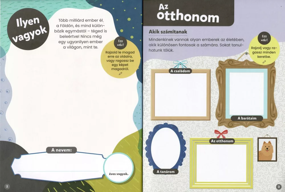 • Lapozzátok végig a füzetet, válasszatok egy feladatot, majd színezzetek, ragasztatok vagy rajzoljatok a megadott instrukciók szerint.
