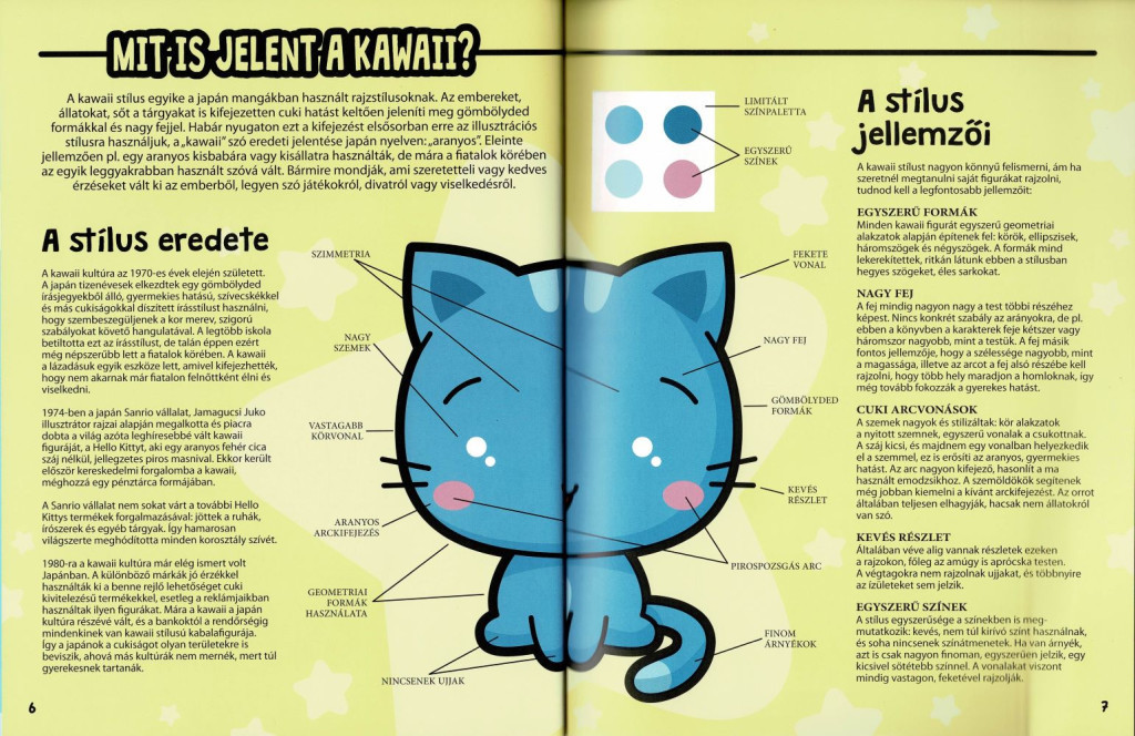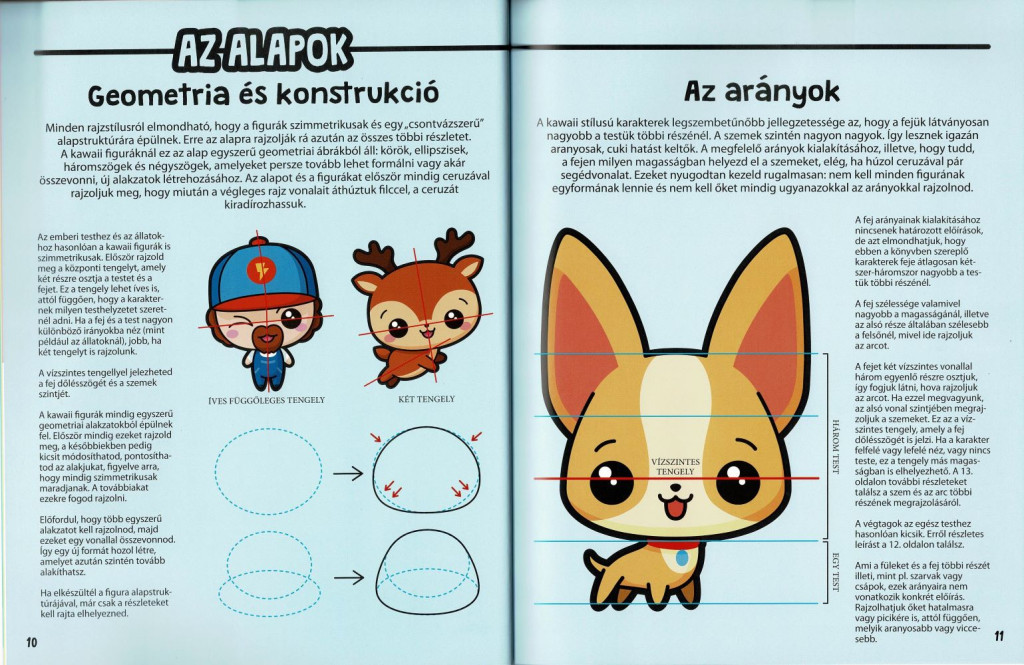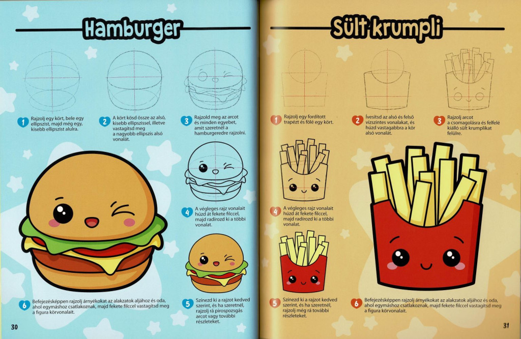 A „Manga karakterek kawaii stílusban” rajzoktató könyv lépésről lépésre vezet be a bájos, nagy fejű és hatalmas szemű figurák világába. Összesen 45 különböző állat, finomság, fantázialény és kedves hős felépítését sajátíthatod el a vázlattól a kontúrig, majd a színezésig. A jól tagolt oldalak, tiszta ábrák és rövid magyarázatok révén gyorsan fejlődik a kézügyességed. Engedd szabadjára a fantáziád, és alkoss cuki, mosolyt csaló jeleneteket!