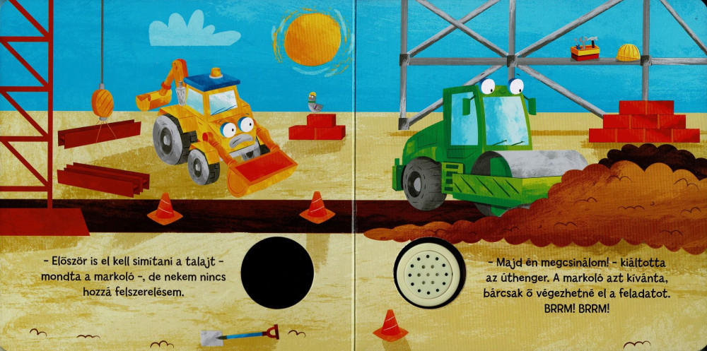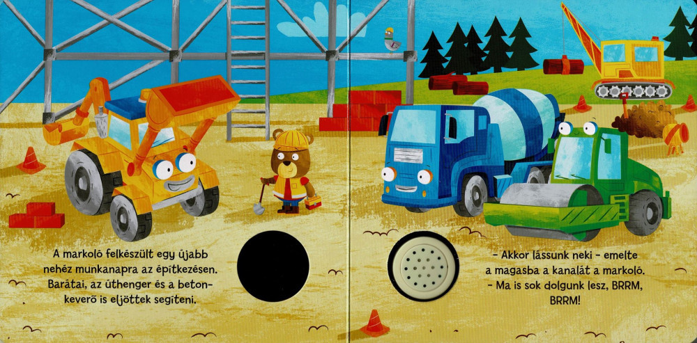 A Mókás Hangok – A Markoló izgalmas hangmodulos lapozó, amelyben a kicsik egy építkezés nyüzsgő világába csöppennek. A vastag kartonlapokra nyomott, élénk illusztrációk egy napját mutatják be a sárga markolónak: földet emel, árkot ás, bójákat kerülget. A beépített hanggomb megnyomásával valósághű „brrm-brrm” motorhang szólal meg, így a gyermek maga is a történet részévé válik, miközben fejlődik a szem-kéz koordinációja.