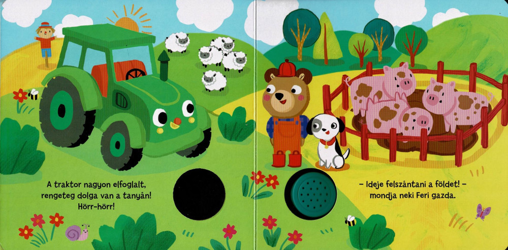A Mókás hangok – A traktor egy masszív, keménylapos lapozó, amelynek beépített hangmodulja igazi pöfögő traktorhanggal teszi élménnyé a közös mesélést. A vidám illusztrációk végigkísérik a kicsiket a zöld járgány mindennapi feladatain: szántás, szállítás, állatok etetése. A gomb megnyomásával a gyerekek egyszerre hallanak és látnak, így az olvasás játékos felfedezéssé válik.