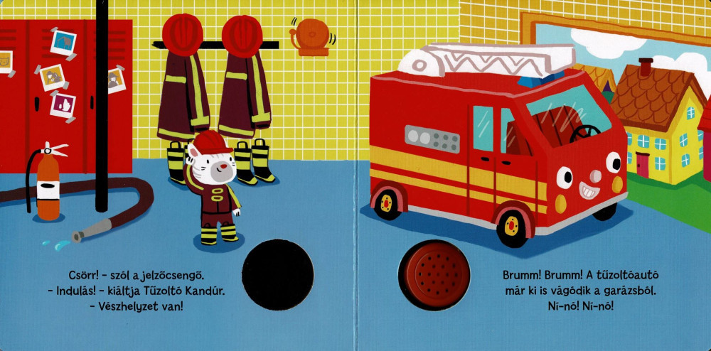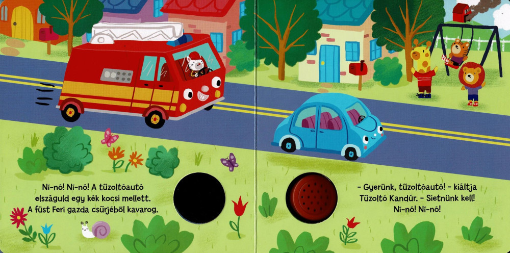 Mókás Hangok – A tűzoltóautó egy strapabíró, keménylapos lapozó, amely a szirénák izgalmas világába repíti a kicsiket. A vastag kartonoldalakon vidám illusztrációk kísérik végig a tűzoltóautó egy napját, az oldalra épített hangmodul pedig egyetlen gombnyomással életre kelti a jellegzetes „ní-nó” szirénát. Olvasás közben a gyerekek egyszerre fedezhetik fel a történetet és válhatnak a mentés részeseivé, miközben fejlődik hallásuk, ritmusérzékük és szókincsük. A lekerekített sarkok és a biztonságos hangszóró kialakítás a legkisebbek kezébe is bátran adhatóvá teszik a könyvet.