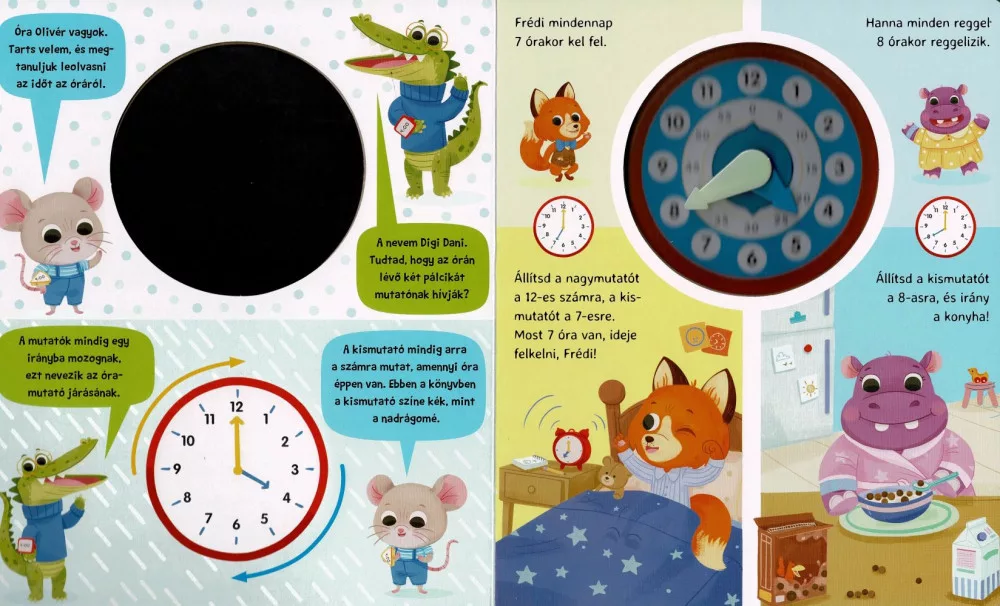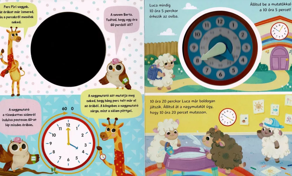 A Mutasd az időt című fejlesztő könyv játékos módon tanítja meg a legkisebbeknek az analóg óra leolvasását. Vastag, strapabíró kartonlapokon színes állatfigurák kísérik végig a gyerekeket a nap fontos eseményein, középen pedig egy beépített, mozgatható mutatós műanyag óra segít az órák és percek gyakorlásában. Állítsd be kedvenc pillanataidat, és meséld el, mikor kezdődik a zsiráf uzsonnája!