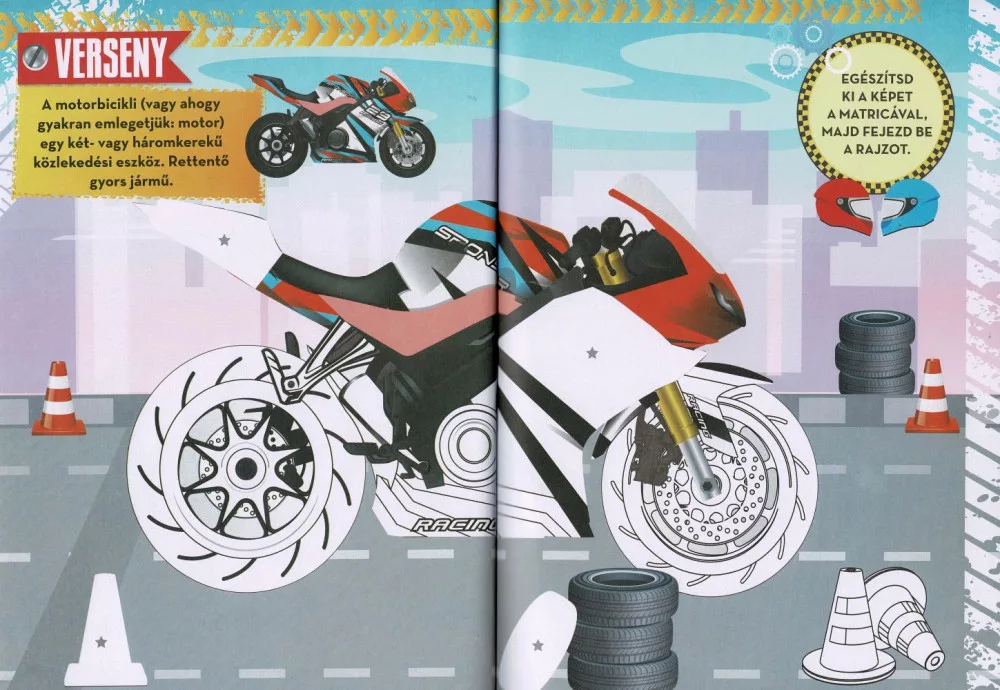A kivehető, könnyen kezelhető matricák és a vastagabb papírra nyomtatott színezőoldalak kényelmes, tiszta élményt biztosítanak; a lapok nem ütnek át még erősebb színezőfilc használatakor sem. A tematikus feladatok szórakoztató módon bővítik a motorokról szerzett ismereteket, így a termék egyszerre kreatív és tanulást segítő eszköz. Kezdő kis alkotóknak is ideális, hiszen a matricák pontos helyét körvonal jelöli, a színezés pedig szabadon variálható – használata kifejezetten könnyű. A haladóbb kézügyességű gyermekek részére is tartogat kihívást a részletgazdag motorábrák árnyalása.