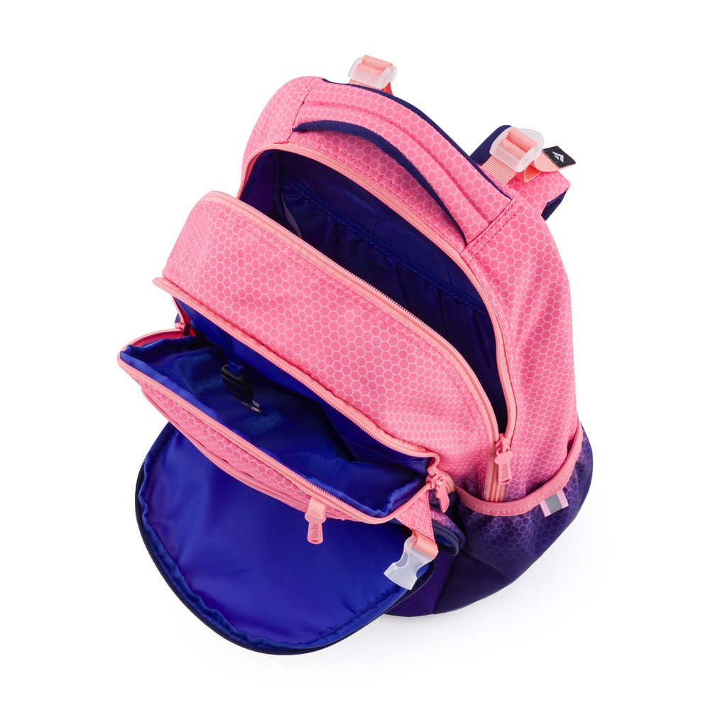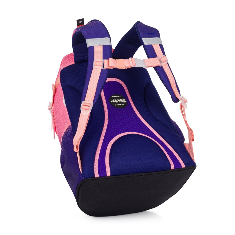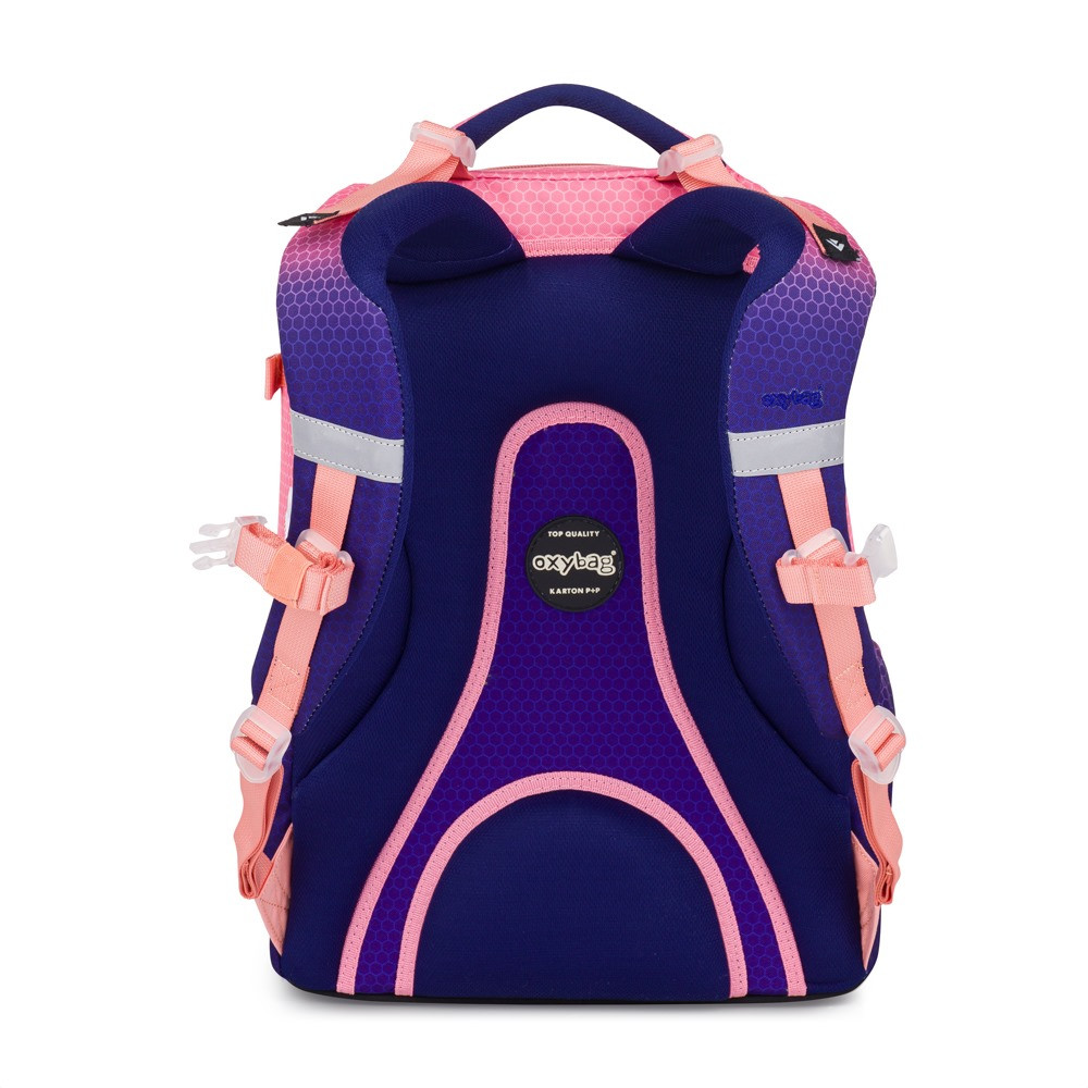 OXY OMBRE Iskolatáska Apricot – könnyű (0,96 kg), ergonomikus hátizsák mindennapos iskolai használatra. A pinkből lilába olvadó ombre mintát diszkrét hatszög struktúra teszi különlegessé, alján fényvisszaverő betéttel a biztonságért. Több rekeszes kialakítása rendszerezett pakolást biztosít, párnázott hátlapja és állítható, szellőző vállpántjai pedig óvják a gerincet.