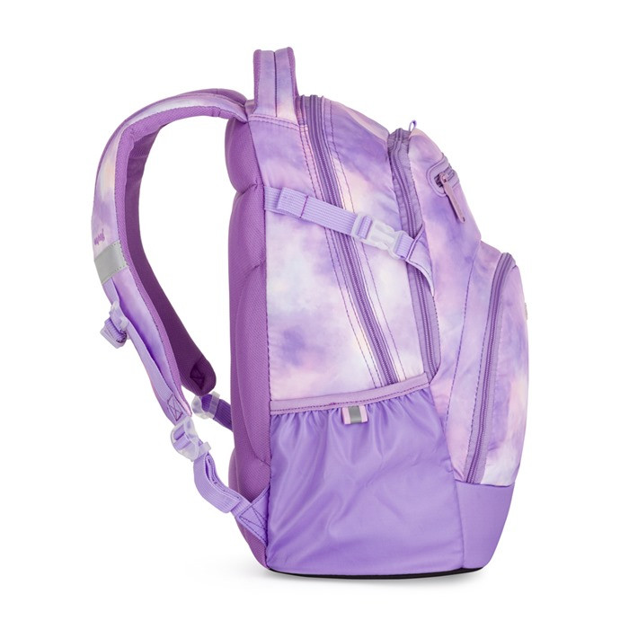 OXY Ombre Iskolatáska Ombre Butterfly – légies, mindössze 0,95 kg súlyú hátizsák lila-rózsaszín ombre felhőmintával és csillogó pillangó függővel. Több cipzáras rekeszének, belső rendszerezőinek és oldalsó kulacstartójának köszönhetően átláthatóan elférnek a tankönyvek, füzetek és apróságok. A párnázott hátpanel és az állítható, ergonomikus vállpántok kímélik a gyermek gerincét, az alsó fényvisszaverő betét pedig növeli a biztonságot a közúton.