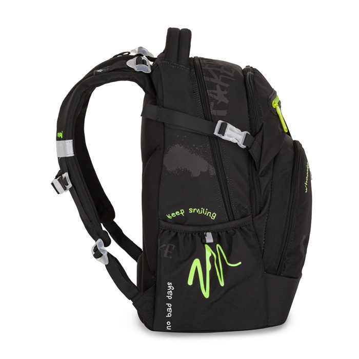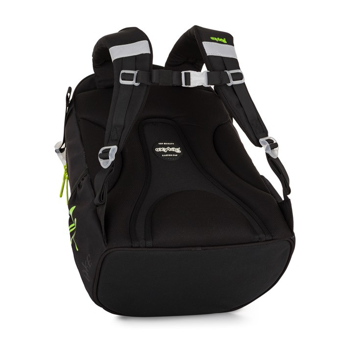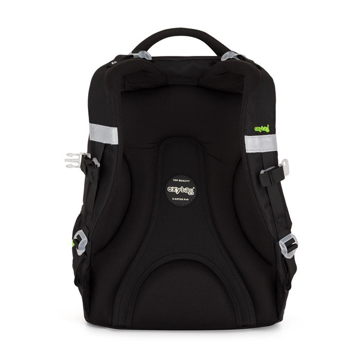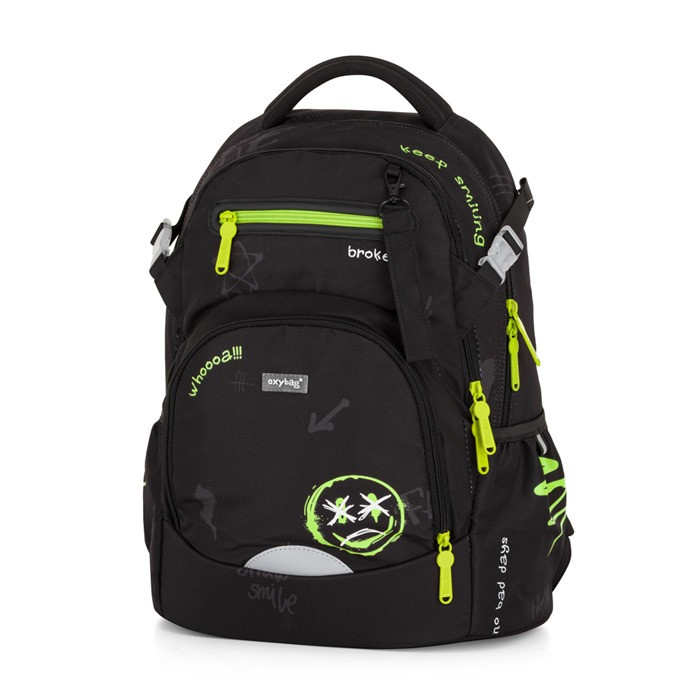 Az OXY Ombre Rebel egy könnyű (mindössze 0,95 kg), mégis masszív iskolatáska felső tagozatosoknak és középiskolásoknak. A fekete alapot élénk neon-zöld cipzárak és graffitis minták dobják fel, így egyszerre vagány és jól látható. Több, cipzárral zárható rekesz rendszerezi a könyveket, füzeteket és kisebb kiegészítőket, oldalzsebeiben kulacs vagy esernyő kap helyet. A hátkialakítás párnázott, a vállpántok állíthatók, hogy egész nap kényelmes maradjon – akár a városi kalandozások, akár a hétköznapi iskolába járás során.