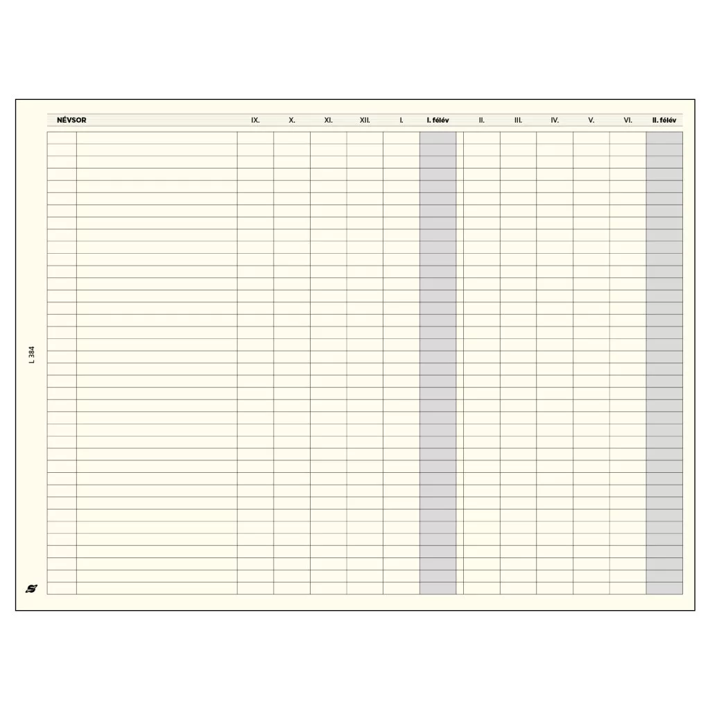 A Saturnus Tanári Betétlap L Névsor Leporelló Chamois segítségével könnyedén, átláthatóan vezetheted tanulóid névsorát és jelenléti adatait. A harmonikaszerűen kihajtható, L méretű papírlap krémszínű (chamois) felületét finom rácsozás és hónapjelölések tagolják, így az egész tanévre elegendő helyet biztosít. A leporelló kialakításnak köszönhetően egyszerre láthatod az összes tanulót és hónapot, ami gyorsítja a kitöltést, ellenőrzést és az adminisztrációt.
