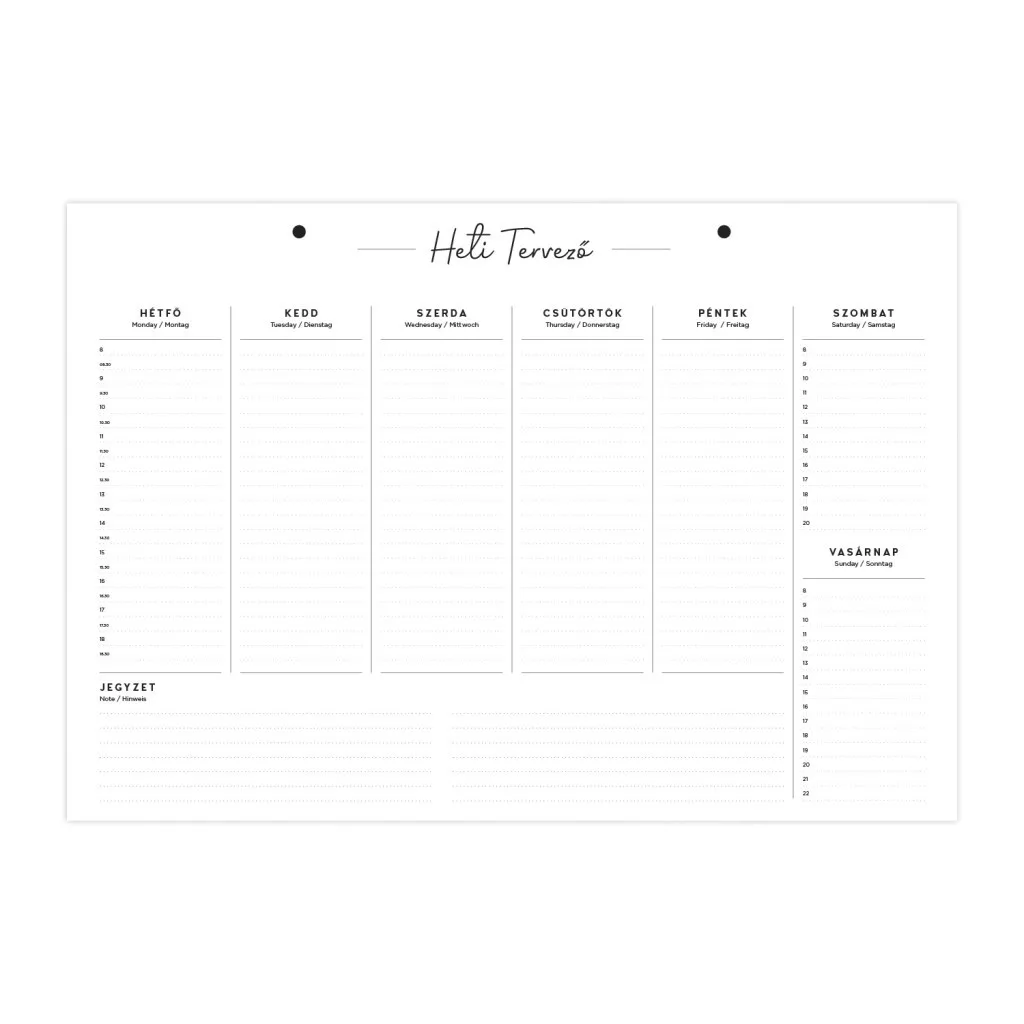 A TopTimer Fali Tervező 44 × 34 cm-es, fekvő formátumú, dátumozatlan IV-es kiadása letisztult, minimalista eszköz a mindennapok átlátható szervezéséhez. A heti bontású elrendezés hétfőtől vasárnapig kínál külön oszlopot, az alsó sávban pedig jegyzetmező segíti a feladat- és ötletgyűjtést. A vastag, fehér kartonpapír két előfúrt akasztólyukkal egyszerűen falra rögzíthető, így szemmagasságban mindig látható marad a heti menetrend.