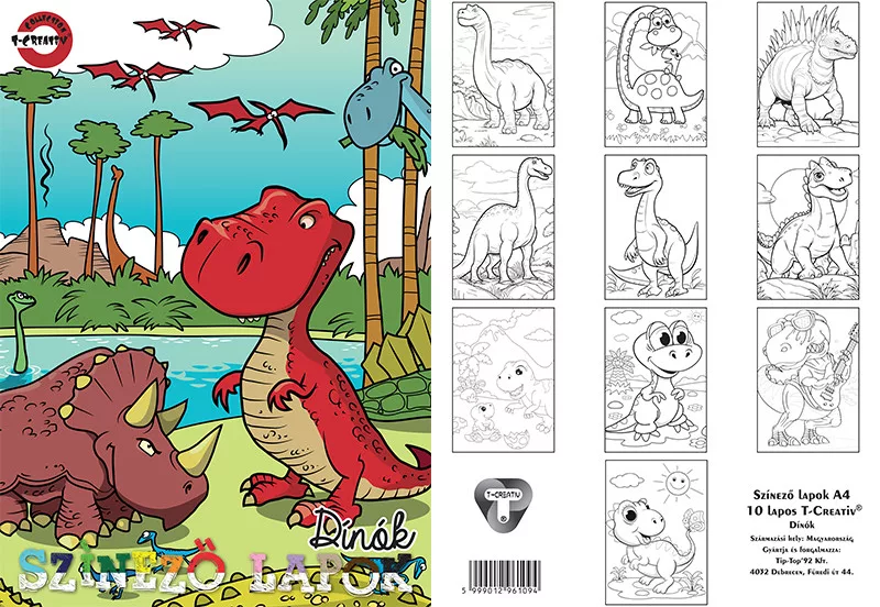 T-Creativ Színező Lapok – Dínók kiadás: egy csomagban 10 db A4-es méretű, fehér papírból készült lap, amelyeken részletgazdag, fekete-fehér dinoszaurusz illusztrációk várják a színeket. A triceratopsztól a repülő pteroszauruszig változatos jelenetek segítik a gyerekeket és a hobbi alkotókat a kreatív kikapcsolódásban. Színes ceruza, filctoll vagy zsírkréta egyaránt remekül mutat rajta – engedd, hogy a jurakor színeiben pompázzon minden lap!