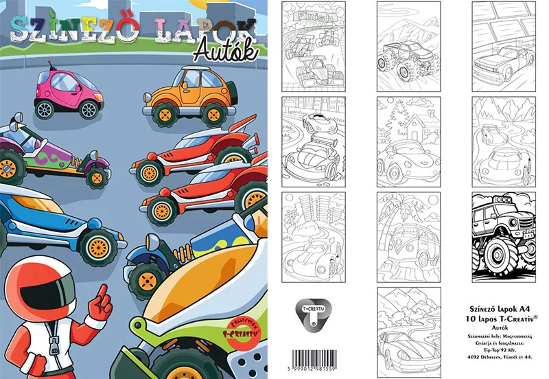 • 10 db előnyomott A4-es színező lap autós motívummal.