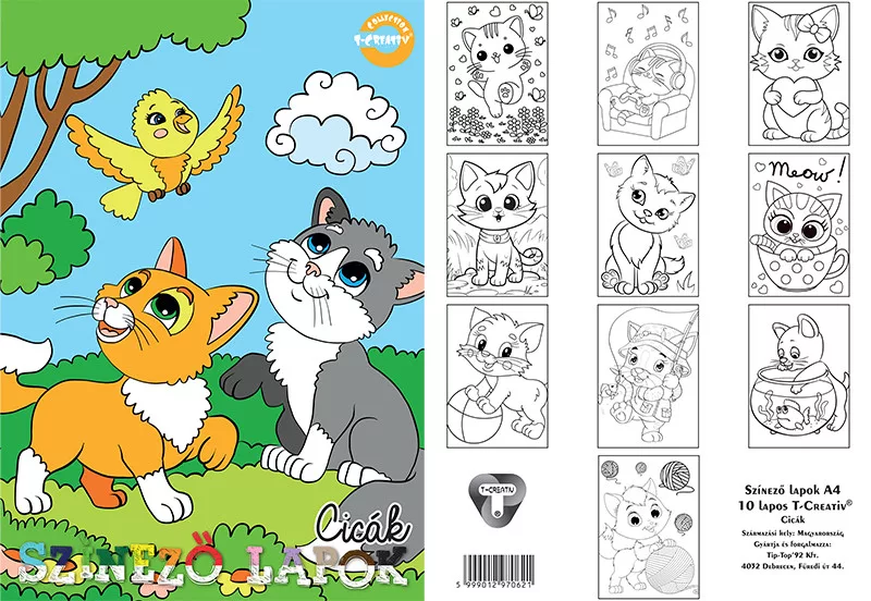 A T-Creativ Színező Lapok „Cicák” kiadása tíz darab, A4 méretű, önállóan kivehető ívet tartalmaz. A fehér rajzlapra fekete kontúrral nyomott, vidám macskás jelenetek csak arra várnak, hogy életre keljenek színes ceruzával, filctollal vagy zsírkrétával. A külön lapos kialakítás egyszerűvé teszi a közös színezést, a kész mű pedig könnyedén bekeretezhető vagy ajándékká válhat.