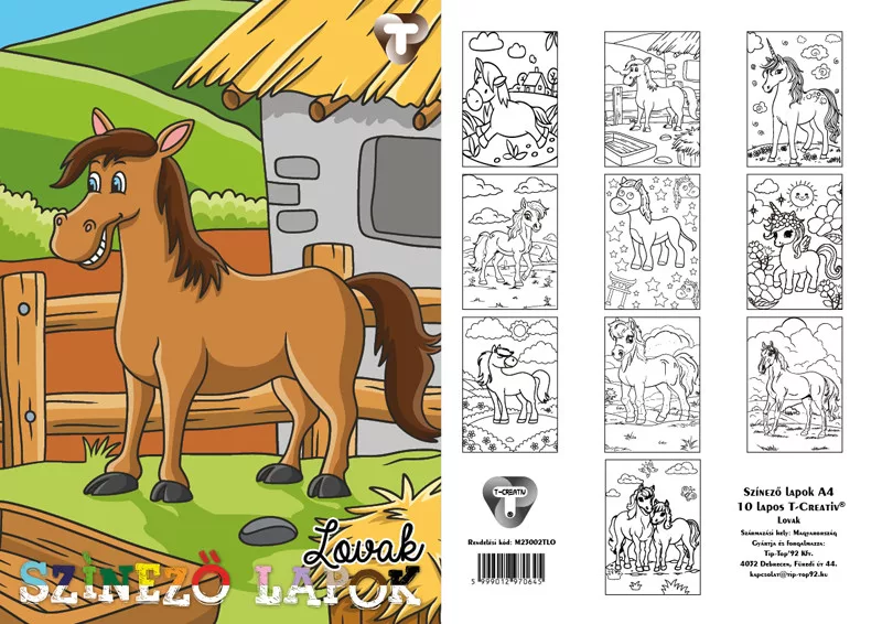 A T-Creativ Színező Lapok „Lovak” csomagja tíz egyedi, részletgazdag ló-motívumot kínál A4-es méretű, fehér rajzpapíron. A kontúrvonalas illusztrációk stabil, jó nedvszívású nyomtatással készültek, így színes ceruzával, filctollal vagy akár akvarellceruzával is szépen fedhetők. A könnyen kezelhető lapokkal a legkisebbektől a gyakorlott hobbi-művészekig bárki szárnyra kaphat: egy délután alatt saját, színes lovas világot teremthetsz.