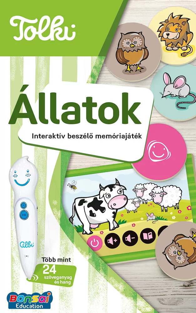 Tolki Memóriajáték – Állatok egy beszélő, interaktív memóriajáték, amelyben kedves állatfigurák segítik a gyerekeket a megfigyelőképesség és a szókincs fejlesztésében. A korongokra érintett Tolki beszélő toll (külön kapható) felolvassa az állatok nevét, jellegzetes hangját, így a hagyományos memóriajáték élménye hanghatásokkal egészül ki. Strapabíró, könnyen tisztítható kartonkorongjai miatt otthoni és óvodai használatra is ideális – ráadásul csak egy pillanat, és már indulhat is a vidám állatkeresés!