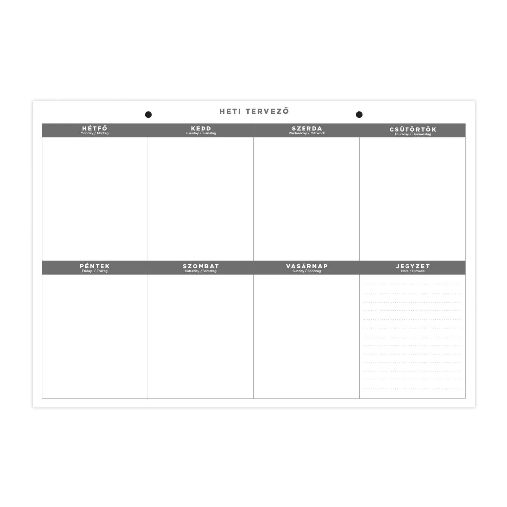 A TopTimer Fali Tervező 44×34 cm-es, vízszintes elrendezésű, dátumozatlan heti naptár, amely egyetlen pillantással áttekinthetővé teszi a hét minden napját. A hétfőtől vasárnapig tagolt mezők mellett külön jegyzet-sáv kapott helyet, így a fontos teendők, bevásárlólisták vagy családi üzenetek sem vesznek el. A két felső akasztólyuknak köszönhetően könnyedén feltehető a falra, irodai paravánra vagy akár a konyhaajtóra, hogy mindig szem előtt legyen.
