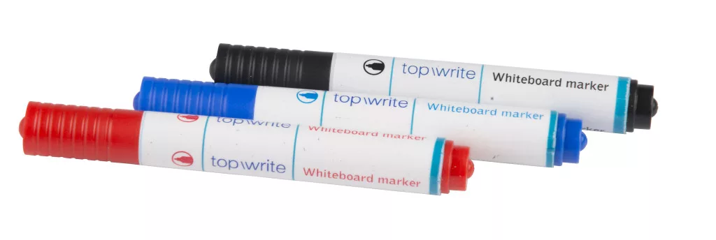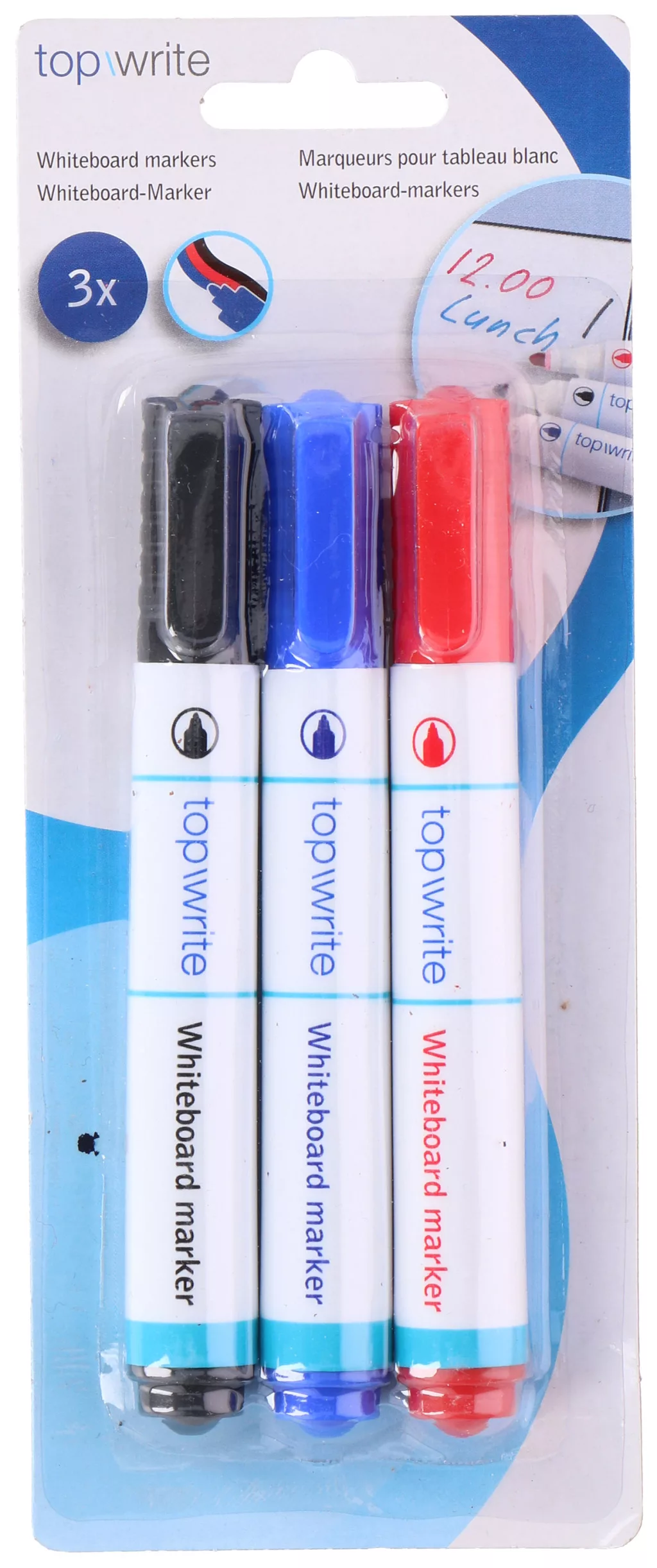 A Topwrite háromdarabos táblafilc-készlet praktikus kiegészítő minden irodai, oktatási vagy otthoni fehértáblához. A fekete, kék és piros markerrel jól elkülöníthetők a feljegyzések, vázlatok és prezentációs kulcspontok. A könnyű, műanyag tolltest kényelmes fogást ad, a szárazon letörölhető tinta pedig foltmentesen távolítható el a tábláról, így gyorsan, tisztán és színesen kommunikálhatsz.