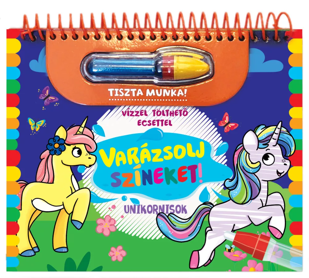 A „Varázsolj Színeket – Unikornisok” egy újrafelhasználható, vízzel színezhető kifestőkönyv, amely tiszta, maszatmentes alkotást kínál a legkisebb művészeknek. Vastag, lakkozott lapjain a minták elsőre fekete-fehérnek tűnnek, ám amint a mellékelt, vízzel tölthető ecsettel áthúzod őket, élénk színek kelnek életre. A lapok száradás után ismét kifehérednek, így a csodás unikornisos jelenetek számtalanszor újraszínezhetők – inspiráló, fenntartható élmény minden kalandvágyó gyermeknek.