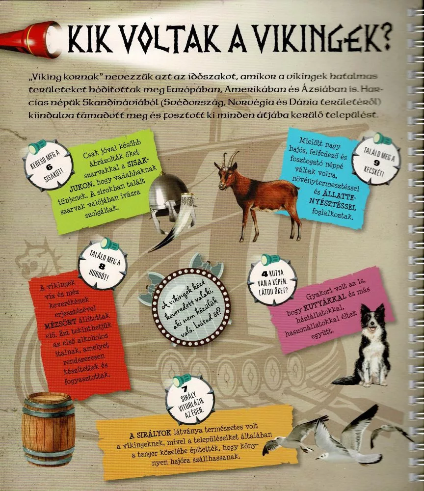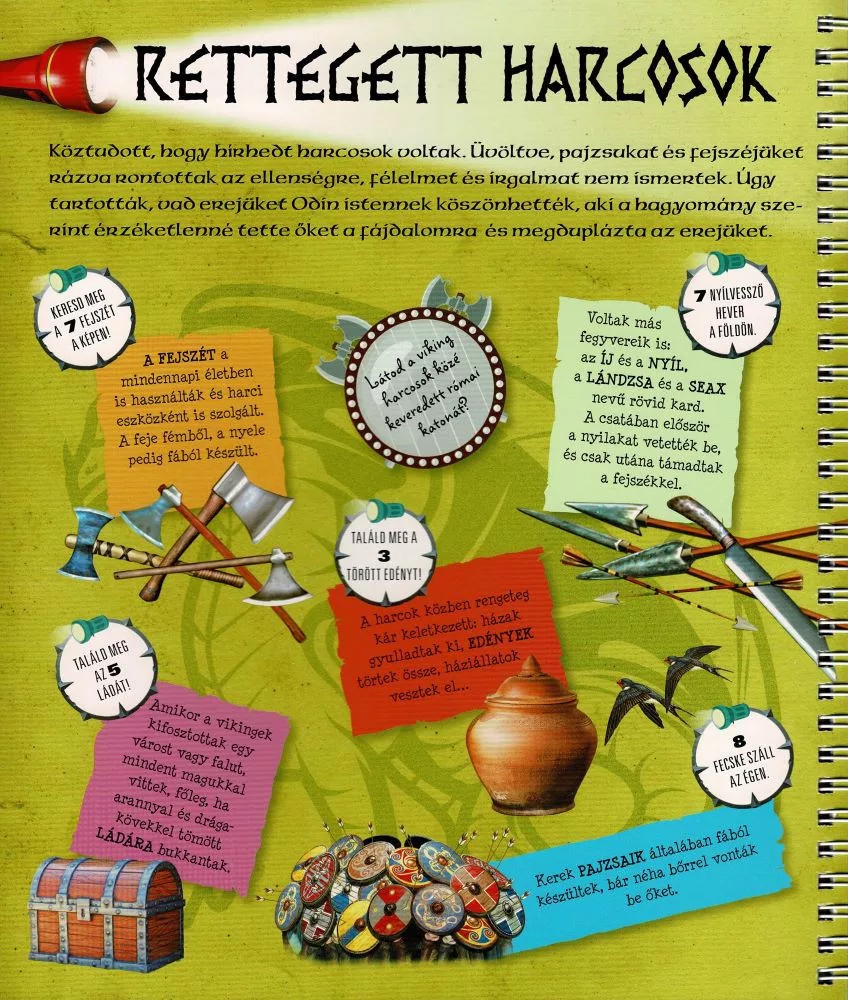 Fedezd fel a hosszúhajós hódítók mindennapjait ezzel az egyedi, zseblámpás könyvvel! A lapok mögött sötétített fólia rejti a középkori Skandinávia titkait, amelyeket a csomagban található papír zseblámpa fénye varázsol elő. Megismerheted a viking hajóépítést, harci technikáikat és isteneik világát, miközben rejtvények és játékos kihívások teszik élménnyé a tanulást – egyszerre olvasmány és kalandos kincskeresés a történelemben.